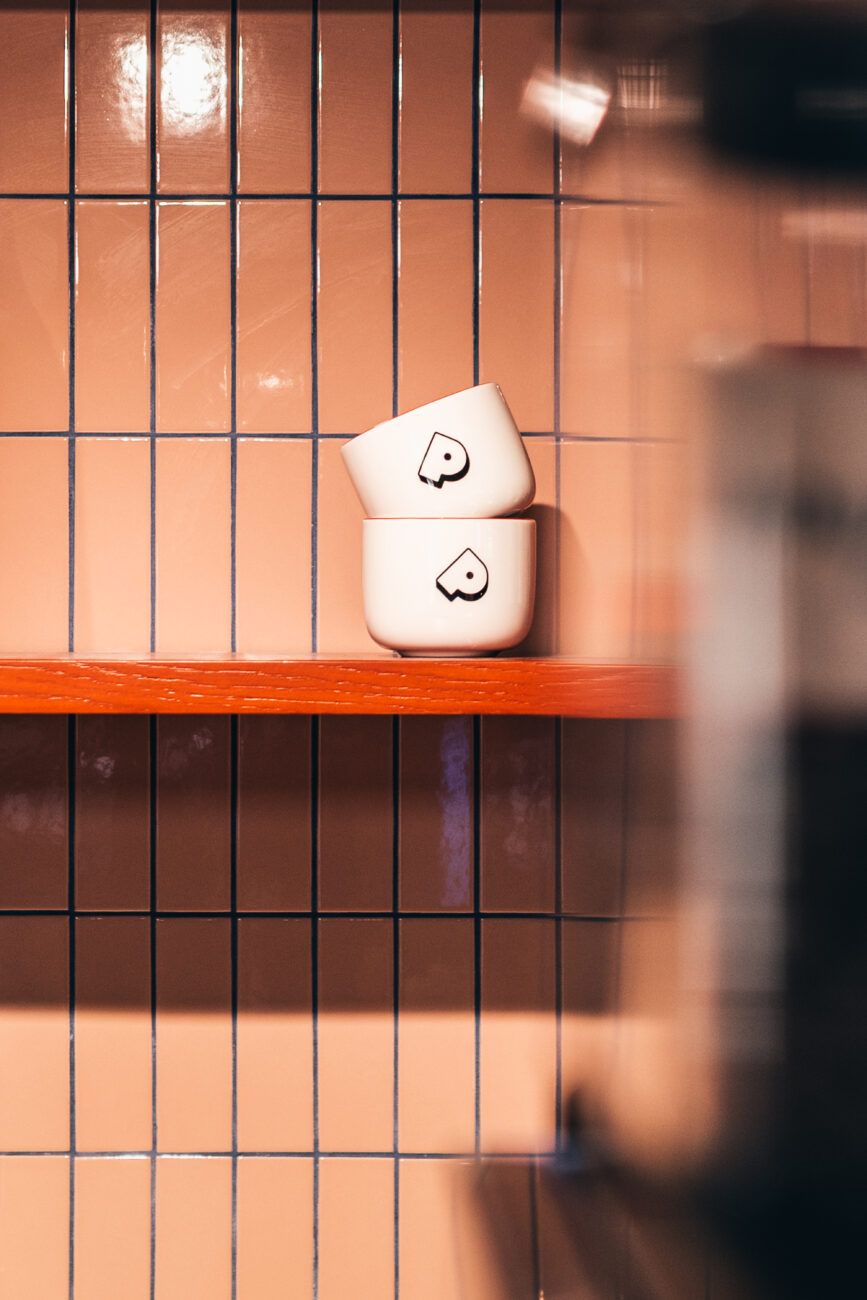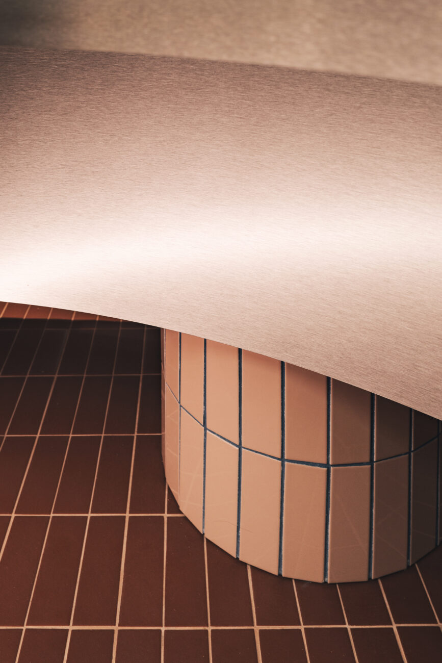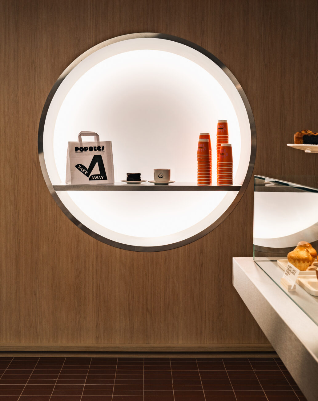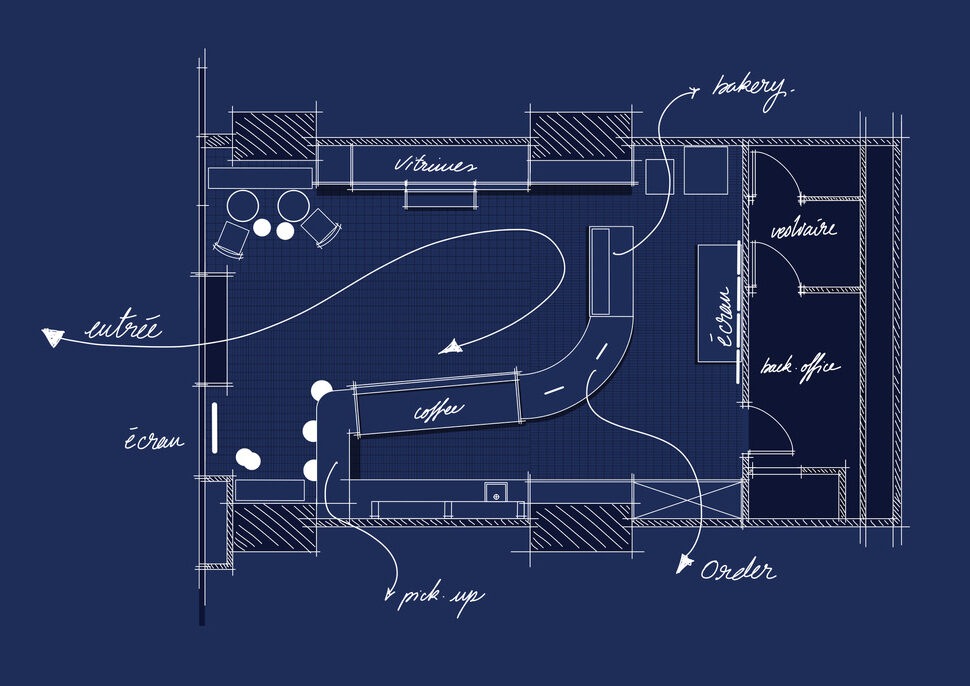Le répertoire géométrique récurrent dans l’œuvre de Vasarely inspire également le dessin des éléments architecturaux : les formes rondes et carrées s’équilibrent, s’imbriquent pour créer un espace à la fois structuré et fluide. Le comptoir monolithique constitue l’objet central du projet : dessiné à partir d’une trame géométrique, il se développe en 3 séquences, par rupture de plans, passant de la ligne fluide au volume cubique dense pour guider la circulation et s’adapter à toutes les étapes du parcours (un comptoir bas et courbe pour rendre visible l’offre pâtisserie, un bloc colorfull plus haut pour la zone coffee, un comptoir haut pick up).